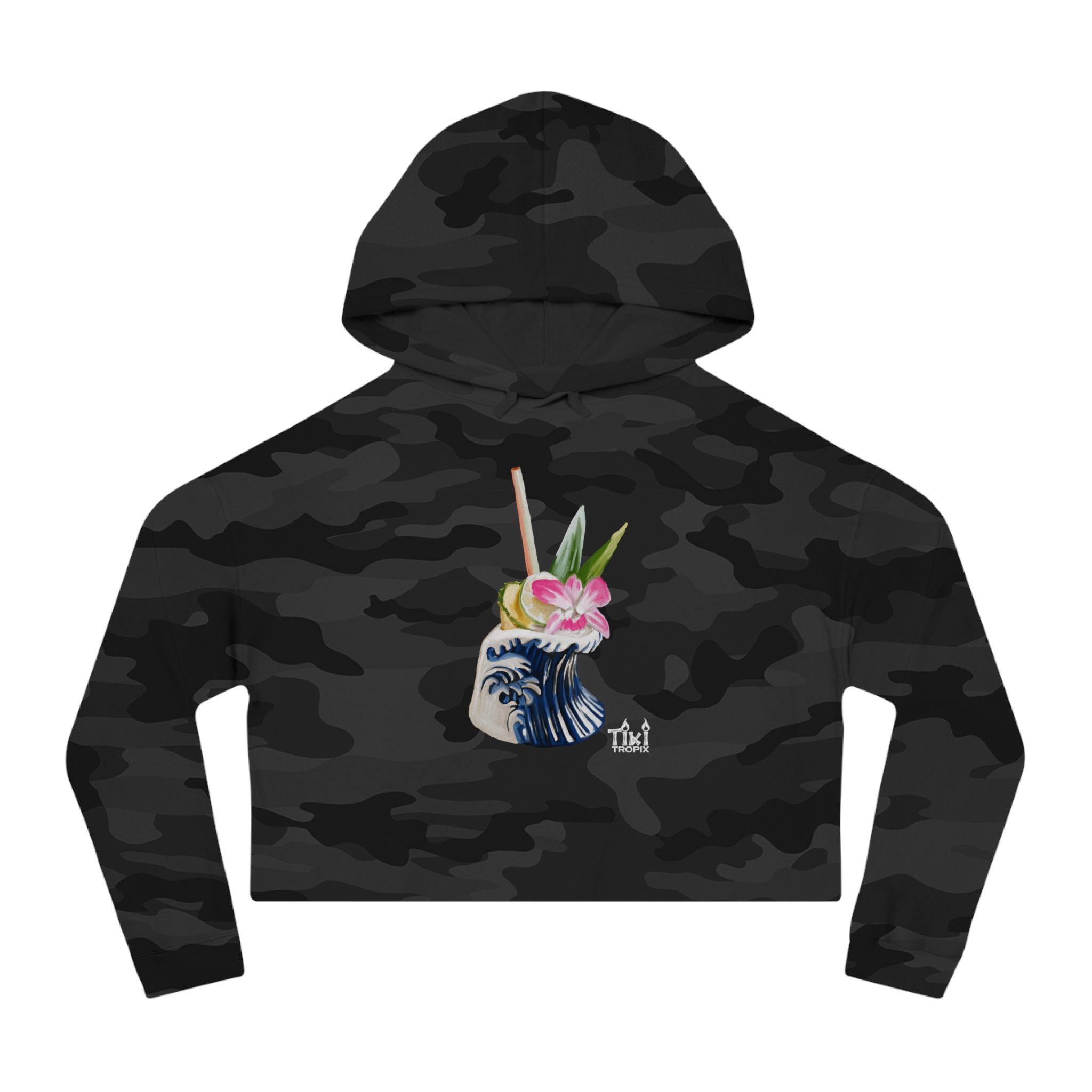 Women’s Tiki Drink Waves Camo Cropped Hooded Sweatshirt With White Logo is a cropped style, black camo pattern with 3/8” flat drawcord. Made with a cozy blend of ring-spun cotton/polyester blend fleece, and with a 100% cotton face yarn – it feels silky soft to the touch and makes for a comfy daily choice.