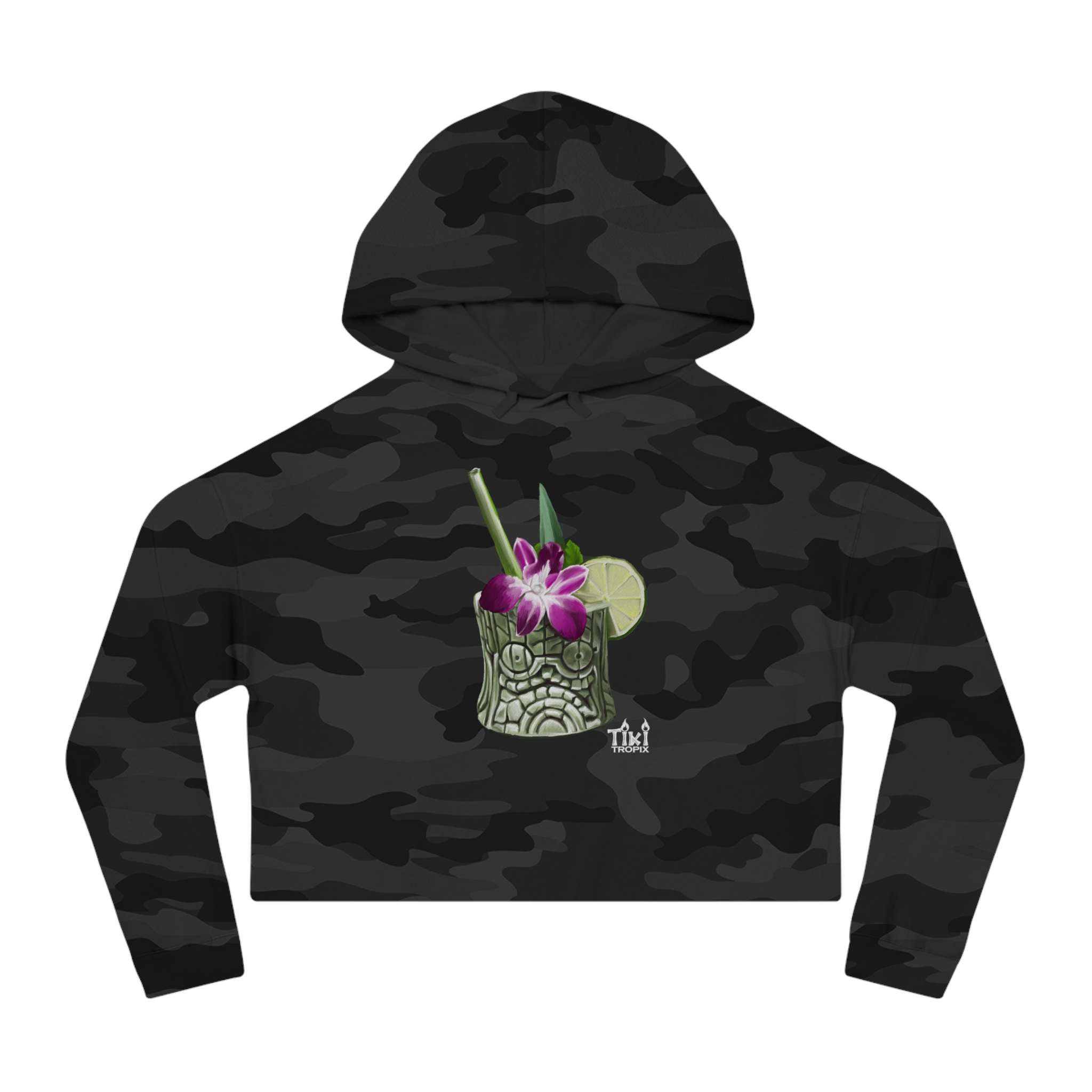 Women’s Tiki Drink Zombi Black Camo Cropped Hooded Sweatshirt With White Logo is a cropped style with 3/8” flat drawcord. Made with a cozy blend of ring-spun cotton/polyester blend fleece, and with a 100% cotton face yarn – it feels silky soft to the touch and makes for a comfy daily choice.